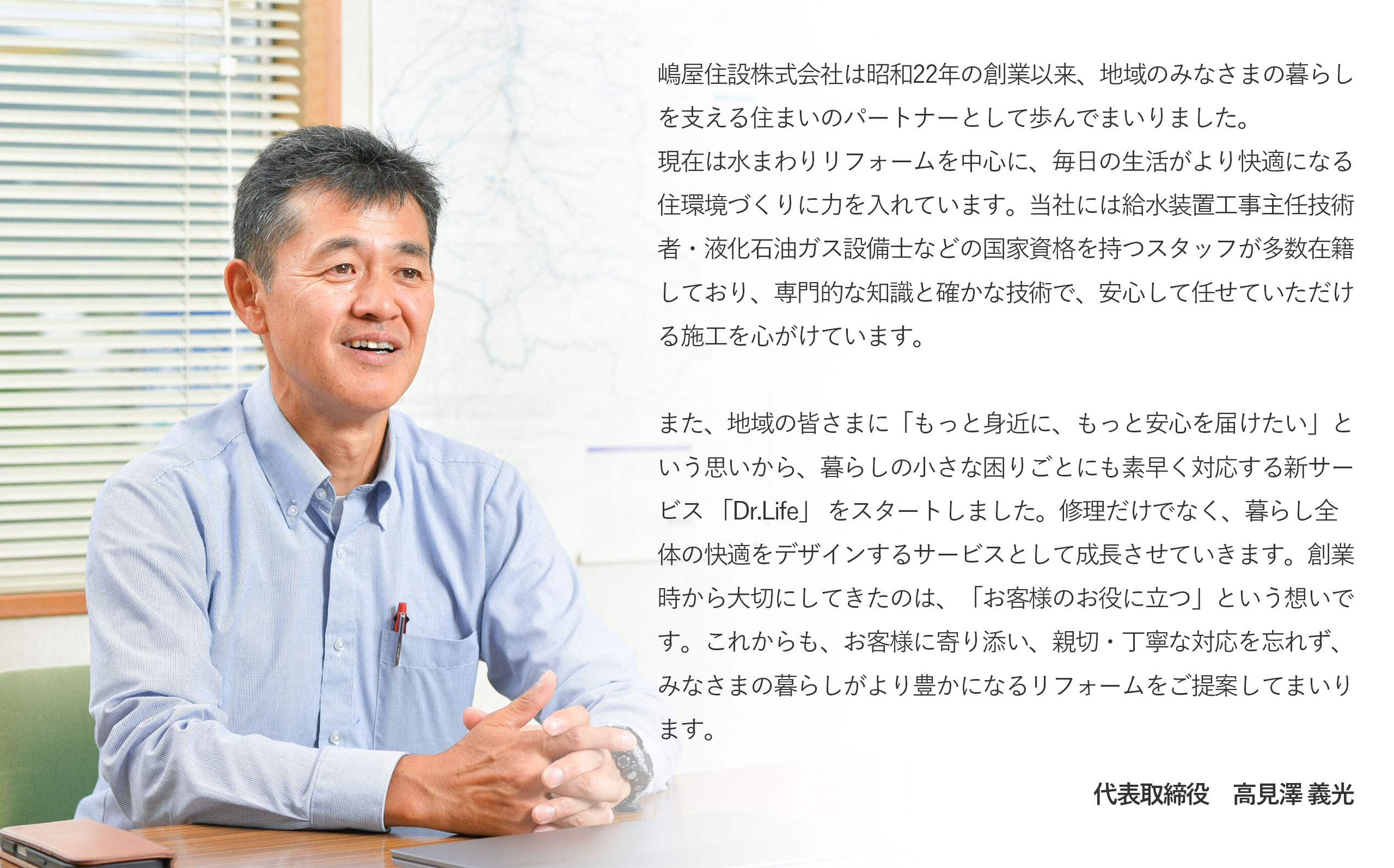 嶋屋住設株式会社は、昭和22年の創業以来、地域のみなさまの暮らしを支える住まいのパートナーとして歩んでまいりました。現在は、水まわりリフォームを中心に、毎日の生活がより快適になる住環境づくりに力を入れています。当社には、給水装置工事主任技術者・液化石油ガス設備士などの国家資格を持つスタッフが多数在籍しており、専門的な知識と確かな技術で、安心して任せていただける施工を心がけています。また、地域の皆さまに「もっと身近に、もっと安心を届けたい」という思いから、暮らしの小さな困りごとにも素早く対応する新サービス 「Dr.Life」 をスタートしました。修理だけでなく、暮らし全体の快適をデザインするサービスとして成長させていきます。創業時から大切にしてきたのは、「お客様のお役に立つ」という想いです。これからも、お客様に寄り添い、親切・丁寧な対応を忘れず、みなさまの暮らしがより豊かになるリフォームをご提案してまいります。